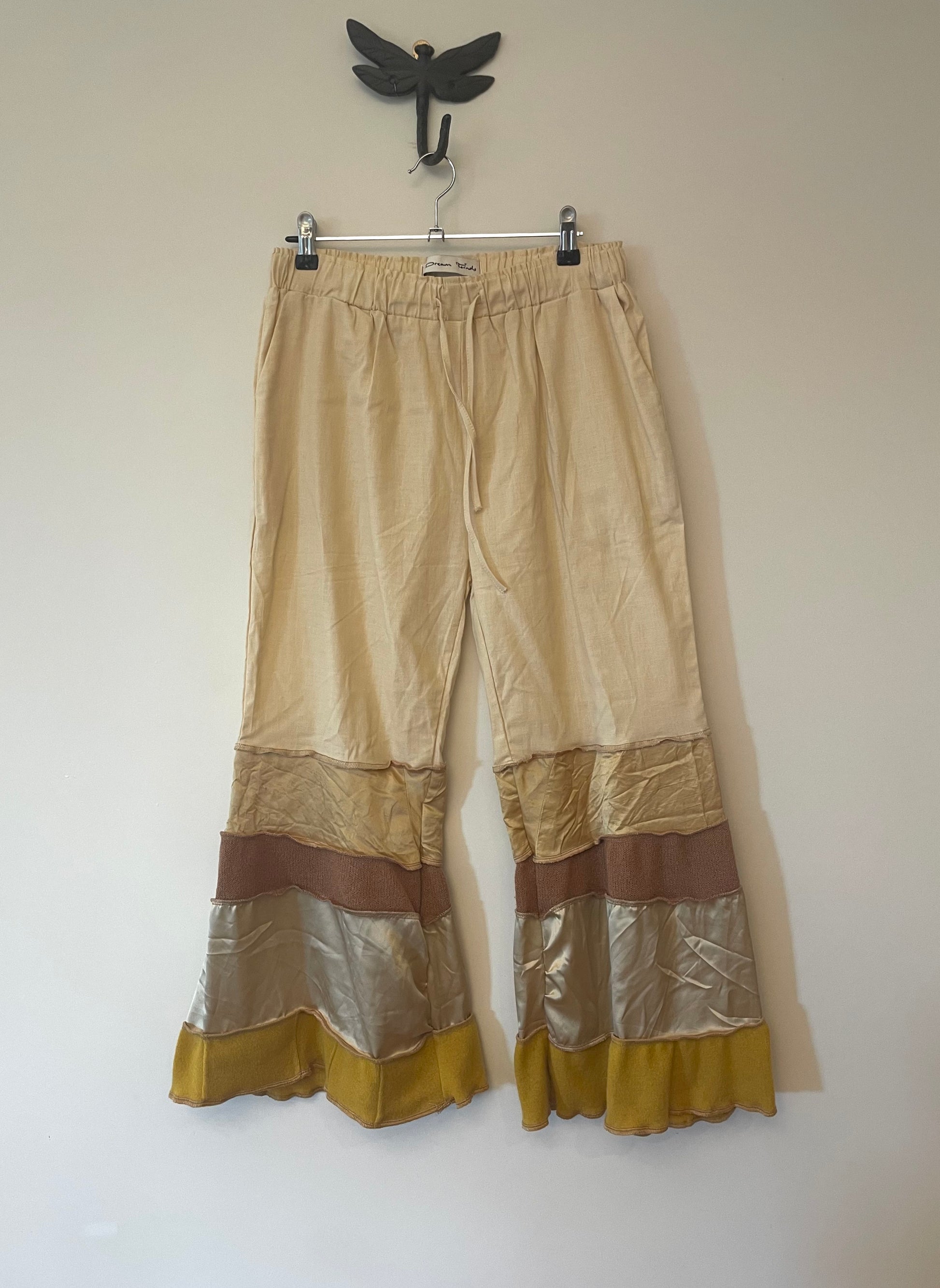 Contains natural and created fibres. (cotton linen, polyester, silk, elastane)